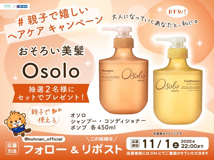 賞品:親子で使えて嬉しいヘアケア「Osolo(オソロ)」(2名様)