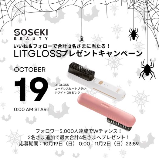 賞品:SOSEKI BEAUTY LITGLOSSコードレスヒートブラシ(2名様)