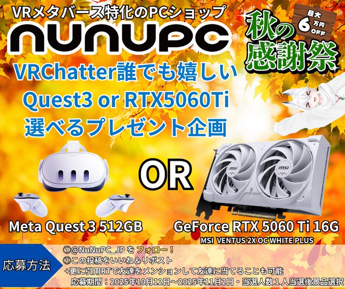 NuNuPC秋の感謝祭セールキャンペーン VRChatter応援!選べるプレゼント企画