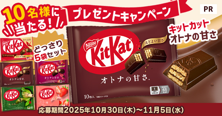 ネスレ日本「キットカット」5種詰め合わせを5名様にプレゼント 2025.10.31 2025.10.30お菓子と、わたし‐読者限定プレゼントキャンペーン 賞品:ネスレ日本「キットカット」5種詰合せ(5名様) 締切:2025年11月5日(水)アンケートに答えてご応募ください。※詳細はキャンペーンページにてご確認ください。応募はこちらから