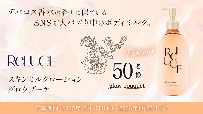 リルーチェ スキンミルクローション グロウブーケを50名様にプレゼント 2025.10.31cosmerepo(コスメルポ)プレゼントキャンペーン 賞品:スキンミルクローション グロウブーケ(50名様) 締切:2026年1月26日(月)コスメルポ会員の方も、会員未登録の方も、どなたでもご応募いただけます。※詳細はキャンペーンページにてご確認ください。応募はこちらから