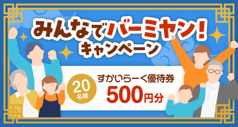 お食事券500円分を20名様にプレゼント 2025.10.31バーミヤン研究所!みんなのももラボ‐みんなでバーミヤン!キャンペーン 賞品:お食事券500円分(20名様) 締切:2026年1月12日(月)13時までコミュニティ参加者の中から、500円のお食事券を20名様にプレゼント!※詳細はキャンペーンページにてご確認ください。応募はこちらから