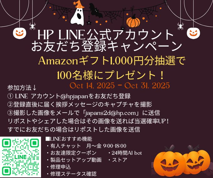【LINE懸賞】Amazonギフト券1,000円分を100名様にプレゼント 2025.10.31HP LINE公式アカウントお友だち登録キャンペーン 賞品:Amazonギフト券1,000円分(100名様) 締切:2025年10月31日(金)Amazonギフト券1,000円分を抽選で100名様にプレゼント!※詳細はキャンペーンページにてご確認ください。応募はこちらから