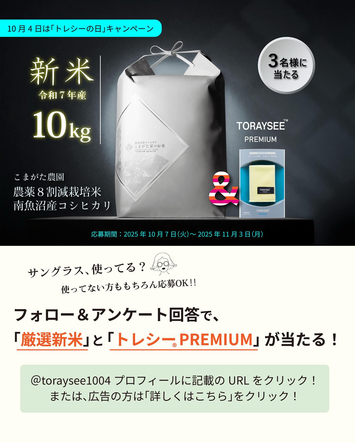 賞品:令和7年産「こまがた家のお米」農薬8割減栽培米 南魚沼産コシヒカリ 10kg、トレシー® PREMIUM(合計23名様)