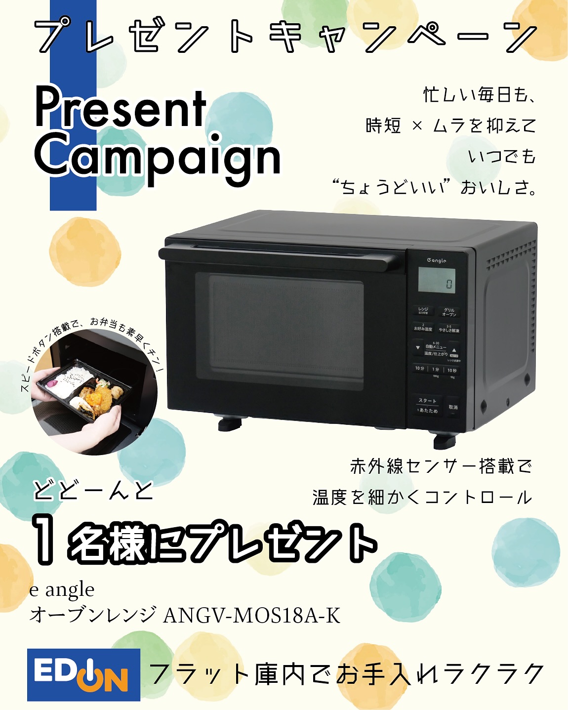 賞品:エディオン プライベートブランド e angle オーブンレンジ ANGV-MOS18A-K(1名様)