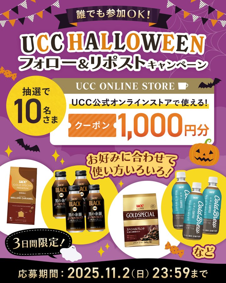 賞品:UCC公式オンラインストアで使えるクーポン1,000円分(10名様)