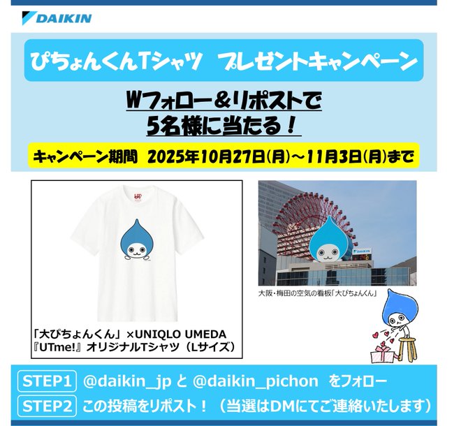 @daikin_jp @daikin_pichon をフォロー&キャンペーン対象ポストをリポストしてご応募ください。