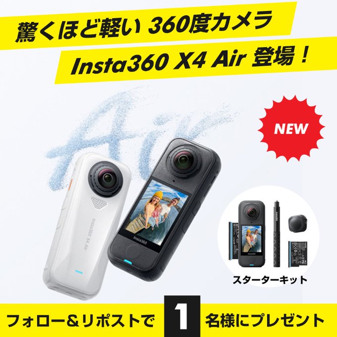 【X懸賞】Insta360 X4 Air スターターキット ブラックを1名様にプレゼント 2025.11.01ヨドバシカメラ‐プレゼントキャンペーン 賞品:Insta360 X4 Air スターターキット ブラック(1名様) 締切:2025年11月3日(月)👉フォロー&リポスト👉このカメラを持ってどこに行きたい❓※詳細はキャンペーンページにてご確認ください。応募はこちらから