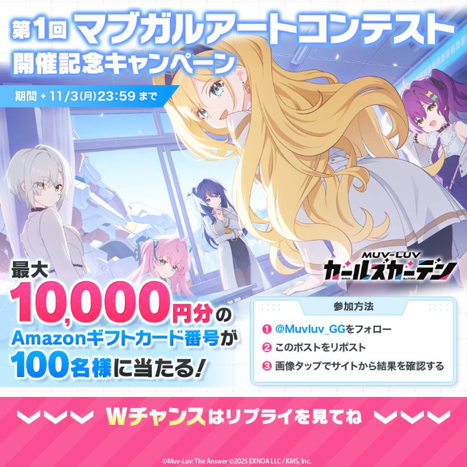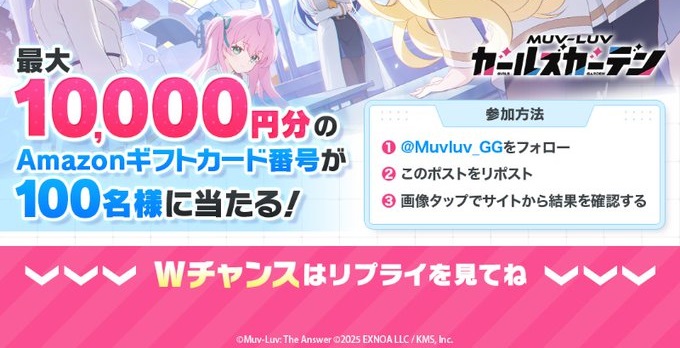 マブラヴ ガールズガーデン公式X(Twitter)アカウントをフォロー&キャンペーン対象ポストをリポストして、キャンペーンページからご応募ください。