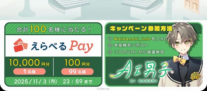 AI男子公式X(Twitter)アカウントをフォロー&キャンペーン対象ポストをリポストして、記載されているURLからご応募ください。