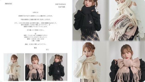 【X懸賞】愛されマフラーを3名様にプレゼント 2025.11.01EATME‐プレゼントキャンペーン 賞品:愛されマフラー(3名様) 締切:2025年11月3日(月)応募方法 ① @EATME_tweet をフォロー ② 投稿をリポスト ③ 希望のマフラーカラーをコメント※詳細はキャンペーンページにてご確認ください。応募はこちらから