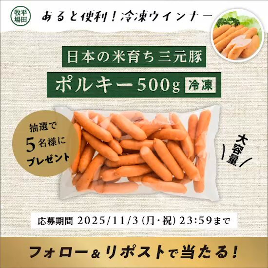 【X懸賞】ポルキー500gを5名様にプレゼント 2025.11.01平田牧場‐フォロー&リポストキャンペーン 賞品:ポルキー500g(5名様) 締切:2025年11月3日(月)公式X(Twitter)アカウントをフォロー&キャンペーン対象ポストをリポストしてご応募ください。※詳細はキャンペーンページにてご確認ください。応募はこちらから