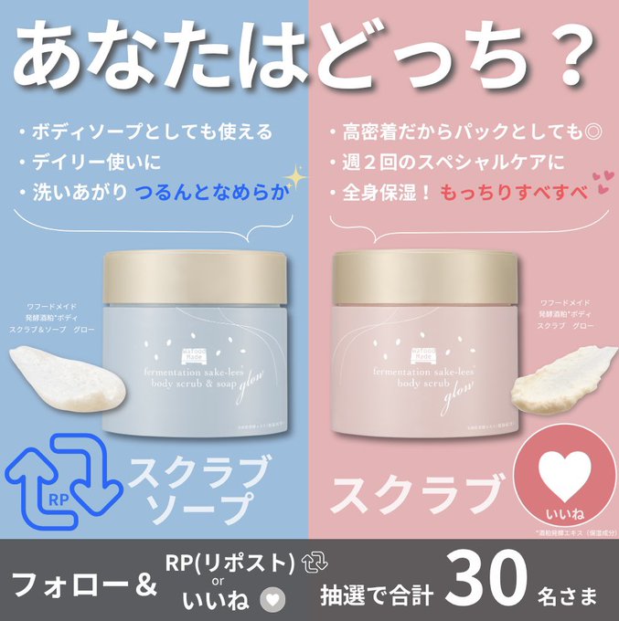 賞品:ワフードメイド 発酵酒粕ボディスクラブ、スクラブ&ソープ(30名様)