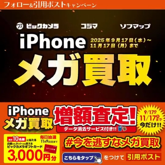 【毎日・X懸賞】ビックカメラギフトカード3,000円分が10名様にその場で当たる! 2025.11.01ビックカメラ‐プレゼントキャンペーン 賞品:ギフトカード3,000円分(10名様) 締切:2025年11月9日(日)1⃣@biccameraEをフォロー 2⃣投稿をハッシュタグをつけて引用ポスト※詳細はキャンペーンページにてご確認ください。応募はこちらから