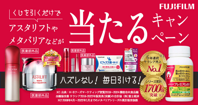 くじを引くと、アスタリフトセットまたはFUJIFILMサプリメントセットや、富士フイルム公式ストア ビューティー&ヘルスケアでご利用いただけるお得なクーポンが当たります。