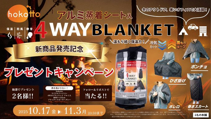 賞品:hokotto マイクロファイバー4WAYブランケット アルミ入(2名様)