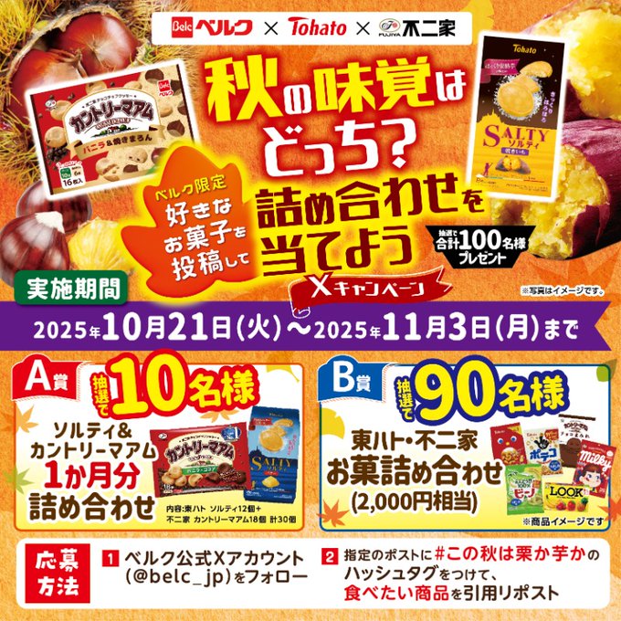 アカウント(@belc_jp)をフォローのうえ、ポストに 「この秋は栗か芋か 」のハッシュタグをつけて「ソルティ焼き芋」「カントリーマアムバニラ&焼きまろん」のどちらが食べたいか引用リポストで投稿した方の中から抽選で計100名様に「オリジナルお菓子詰め合わせ」をプレゼント。