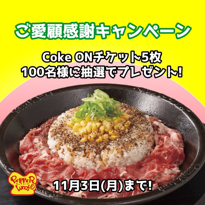 【X懸賞】Coke ONチケット5枚を100名様にプレゼント 2025.11.01ペッパーランチ‐フォロー&リポストキャンペーン 賞品:Coke ONチケット5枚(100名様) 締切:2025年11月3日(月)応募方法: フォロー 投稿をリポスト&いいね※詳細はキャンペーンページにてご確認ください。応募はこちらから