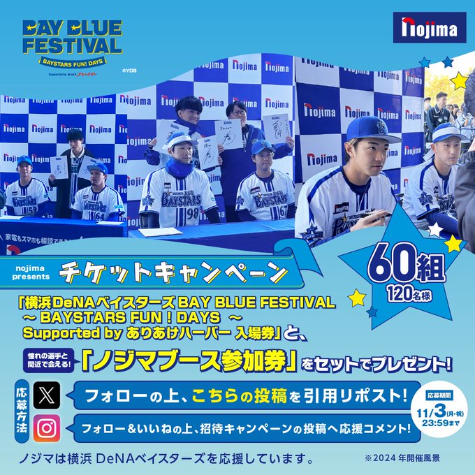 賞品:BAY BLUE FESTIVAL 〜BAYSTARS FUN ! DAYS〜 Supported by ありあけハーバー 入場券+ノジマブースの参加券(60組120名様)