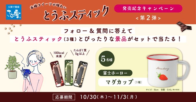 【X懸賞】「とうふスティック」&富士ホーローの「マグカップ」を5名様にプレゼント 2025.11.01さとの雪‐プレゼントキャンペーン 賞品:「とうふスティック」&富士ホーローの「マグカップ」(5名様) 締切:2025年11月3日(月)①@satonoyuki1 をフォロー ②回答を選択※詳細はキャンペーンページにてご確認ください。応募はこちらから