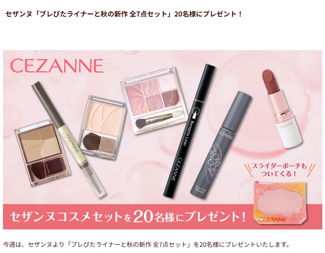 セザンヌ ブレぴたライナーと秋の新作 全7点セットを20名様にプレゼント 2025.11.01王様のブランチ‐プレゼントキャンペーン 賞品:ブレぴたライナーと秋の新作 全7点セット(20名様) 締切:2025年11月2日(日)応募フォームより必要事項を入力してご応募ください。※詳細はキャンペーンページにてご確認ください。応募はこちらから