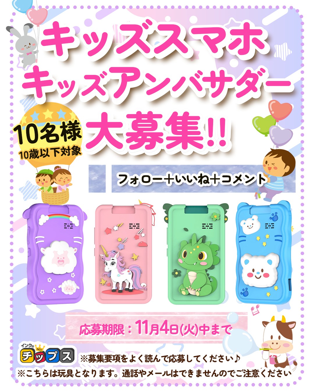 【Instagram懸賞】キッズスマホを10名様にプレゼント 2025.11.02インクのチップス‐キッズスマホアンバサダー大募集 賞品:キッズスマホ(10名様) 締切:2025年11月4日(火)キッズスマホのキッズアンバサダーを募集中※詳細はキャンペーンページにてご確認ください。応募はこちらから