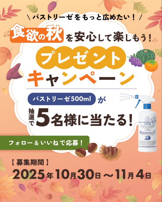 【X懸賞】パストリーゼ500mlを5名様にプレゼント 2025.11.02パストリーゼ77‐プレゼントキャンペーン 賞品:パストリーゼ500ml(5名様) 締切:2025年11月4日(火)応募方法 ・フォロー&いいね※詳細はキャンペーンページにてご確認ください。応募はこちらから