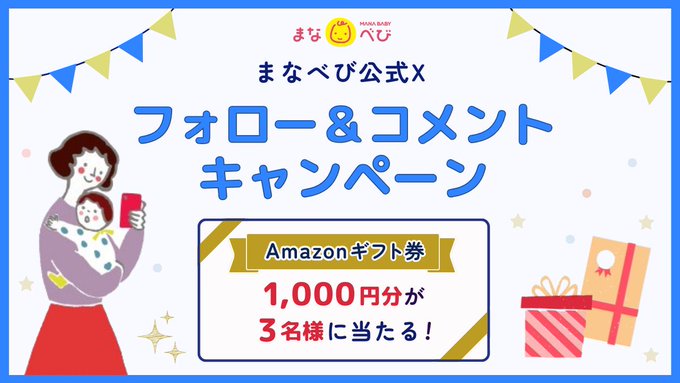 【X懸賞】Amazonギフト券1,000円分を3名様にプレゼント 2025.11.02まなべび‐教えて🥄みんなの #離乳食 エピソード 賞品:Amazonギフト券1,000円分(3名様) 締切:2025年11月4日(火)1⃣フォロー 2⃣コメント 3⃣RT で応募完了🙆※詳細はキャンペーンページにてご確認ください。応募はこちらから