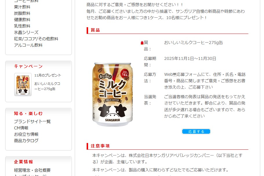 おいしいミルクコーヒー275g缶 1ケースを10名様にプレゼント 2025.11.03 2025.11.02サンガリア 今月のプレゼント 賞品:おいしいミルクコーヒー275g缶 1ケース(10名様) 締切:2025年11月30日(日)商品に対するご意見・ご感想をお聞かせください!※詳細はキャンペーンページにてご確認ください。応募はこちらから