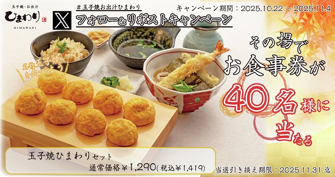 玉子焼·お出汁 ひまわり公式X(Twitter)アカウントをフォロー&キャンペーン対象ポストをリポストして、記載されているURLからご応募ください。