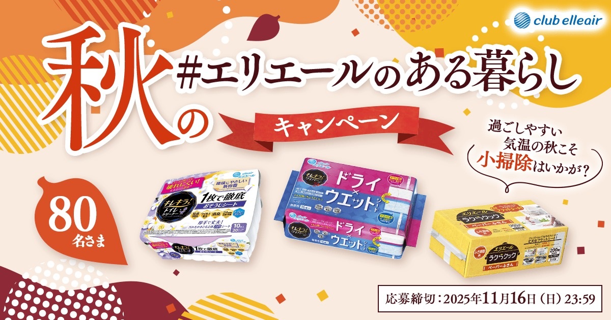 最新フロアワイパー含む3点セットを80名様にプレゼント 2025.11.03秋の「#エリエールのある暮らし」キャンペーン 賞品:最新フロアワイパー含む3点セット(80名様) 締切:2025年11月16日(日)ご応募には会員登録/ログインが必要です。※詳細はキャンペーンページにてご確認ください。応募はこちらから