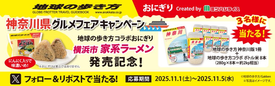 賞品:地球の歩き方神奈川版1冊とボトル米(3名様)