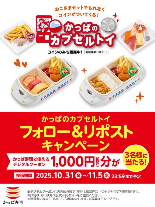 【X懸賞】かっぱ寿司で使えるデジタルクーポン1,000円分を3名様にプレゼント 2025.11.03かっぱ寿司‐プレゼントキャンペーン 賞品:かっぱ寿司で使えるデジタルクーポン1,000円分(3名様) 締切:2025年11月5日(水)1️⃣@kappasushi_jp をフォロー 2️⃣投稿をいいね♡リポスト※詳細はキャンペーンページにてご確認ください。応募はこちらから