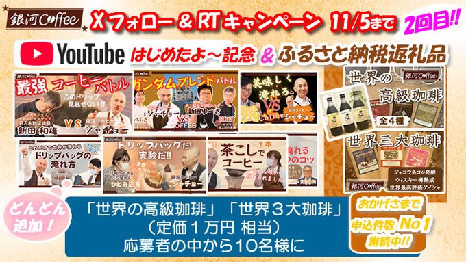 【X懸賞】高級珈琲セットを10名様にプレゼント 2025.11.03銀河コーヒー YouTube開始記念 賞品:高級珈琲セット(10名様) 締切:2025年11月5日(水)公式X(Twitter)アカウントをフォロー&キャンペーン対象ポストをリポストしてご応募ください。※詳細はキャンペーンページにてご確認ください。応募はこちらから