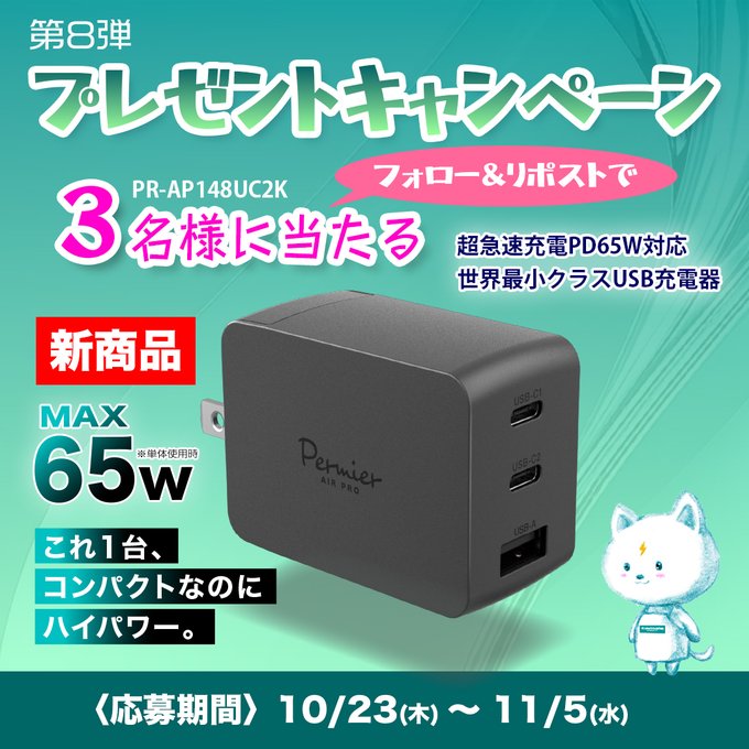 賞品:超急速充電可能PD(パワーデリバリー)対応USB充電器(3名様)