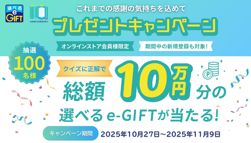 オンラインストア会員様&クイズに正解した方の中から、抽選で100名様に総額10万円分の選べるe-GIFTをプレゼント