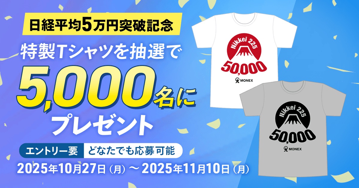 日経平均5万円突破記念Tシャツを5,000名様にプレゼント 2025.11.04マネックス証券‐日経平均5万円突破記念 賞品:日経平均5万円突破記念Tシャツ(5,000名様) 締切:2025年11月10日(月)応募フォームより必要事項を入力してご応募ください。※詳細はキャンペーンページにてご確認ください。応募はこちらから