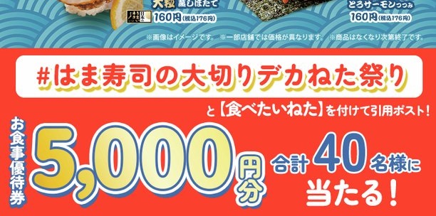 賞品:はま寿司で使えるお食事優待券5,000円分(40名様)