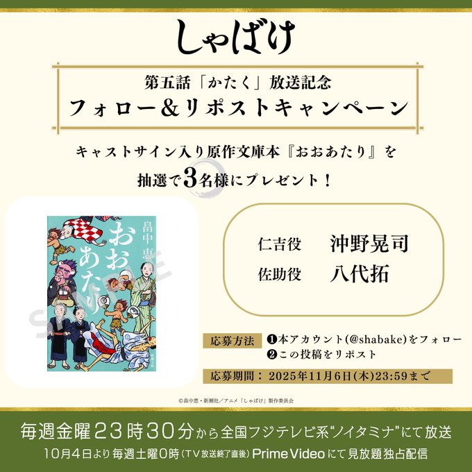 賞品:#沖野晃司 #八代拓 サイン入りの原作文庫本「おおあたり」(3名様)