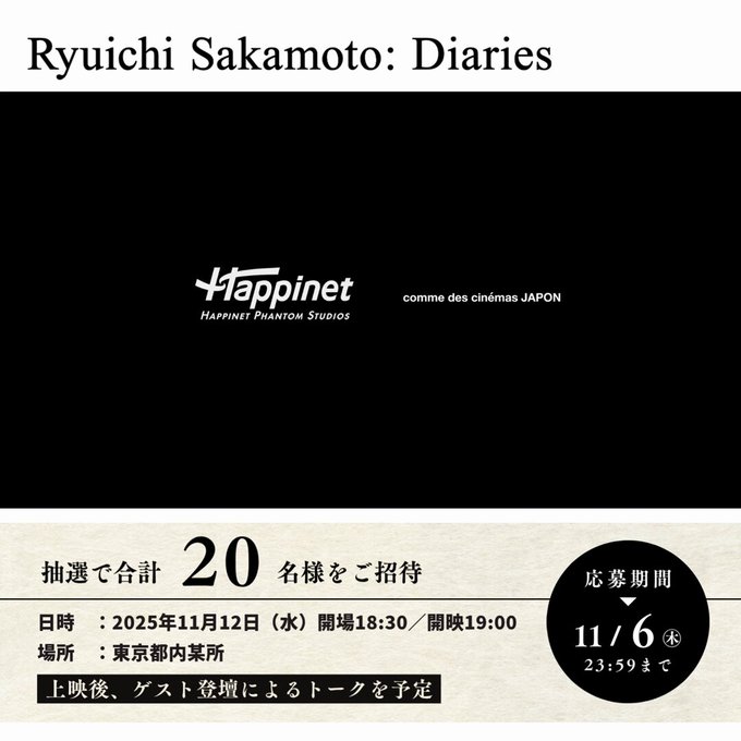 賞品:映画『Ryuichi Sakamoto: Diaries』試写会ご招待(20名様)