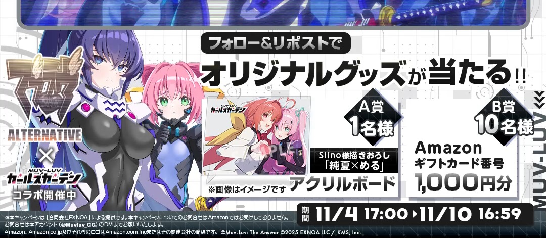 マブラヴ ガールズガーデン公式X(Twitter)アカウントをフォロー&キャンペーン対象ポストをリポストして、キャンペーンページからご応募ください。