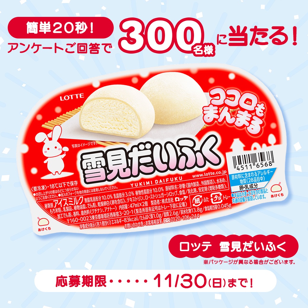【LINE懸賞】ロッテ 雪見だいふく 無料引き換えクーポンを300名様にプレゼント 2025.11.05フコク生命‐LINE友だちアンケート 賞品:ロッテ 雪見だいふく 無料クーポン(300名様) 締切:2025年11月30日(日)アンケートにご回答いただいた方の中から抽選でプレゼント!※詳細はキャンペーンページにてご確認ください。応募はこちらから