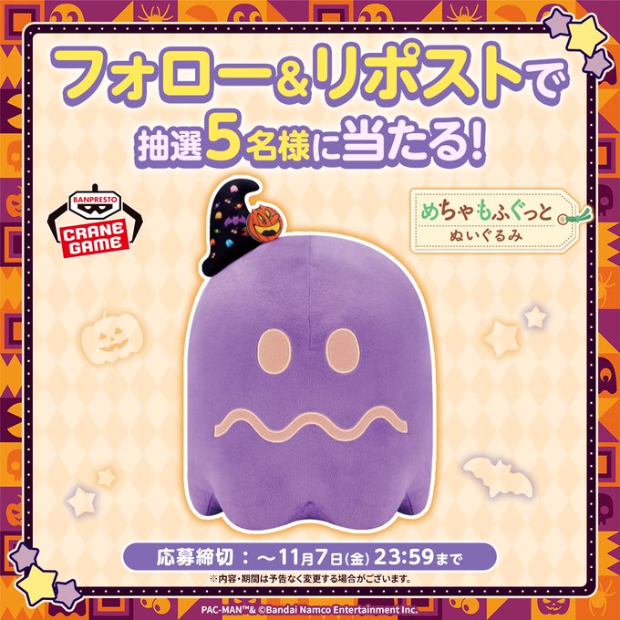賞品:パックマン めちゃもふぐっとぬいぐるみ~ghost party~(5名様)