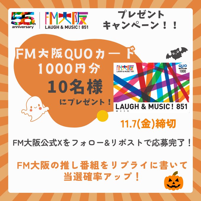 賞品:FM大阪特製QUOカード1,000円分(10名様)
