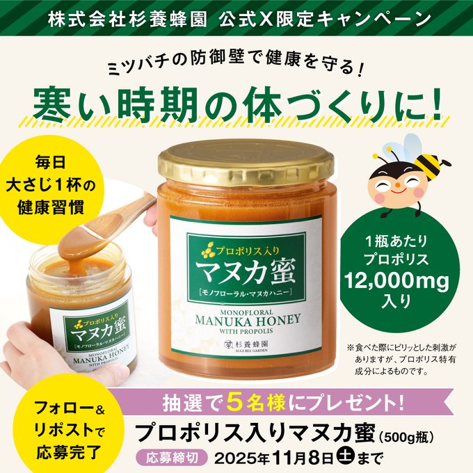 賞品:プロポリス入りマヌカ蜜(5名様)