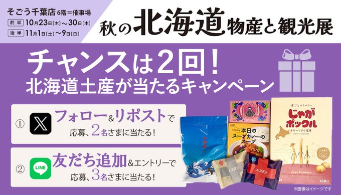 【X懸賞】北海道土産を5名様にプレゼント 2025.11.05そごう千葉店‐秋の北海道物産と観光展開催中!SNS #キャンペーン 賞品:北海道土産(5名様) 締切:2025年11月8日(土)X・LINEでそれぞれ応募、抽選で合計5名さまに、北海道土産が当たる※詳細はキャンペーンページにてご確認ください。応募はこちらから