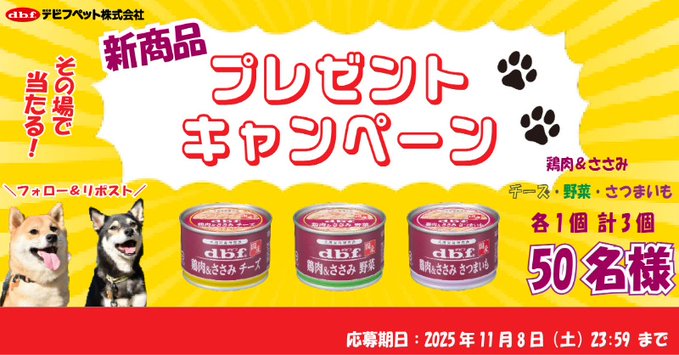 【X懸賞】150g缶鶏肉&ささみシリーズが50名様にその場で当たる! 2025.11.05デビフペット‐プレゼントキャンペーン 賞品:150g缶鶏肉&ささみシリーズ(50名様) 締切:2025年11月8日(土)応募方法 ①アカウントをフォロー ②リポスト ③X連携し結果をチェック!※詳細はキャンペーンページにてご確認ください。応募はこちらから