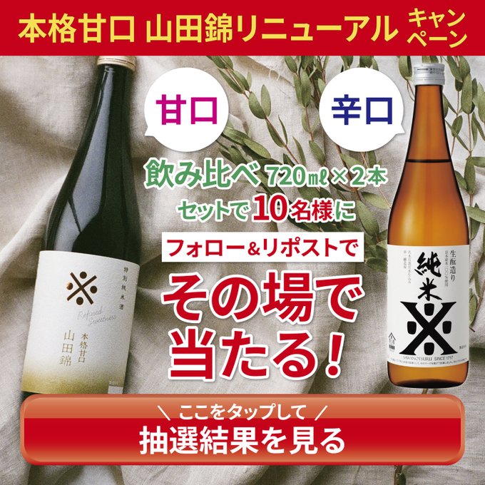 賞品:特別純米酒 本格甘口山田錦 720ml×1本(甘口)と、純米酒720ml×1本(辛口)の2本セット(10名様)