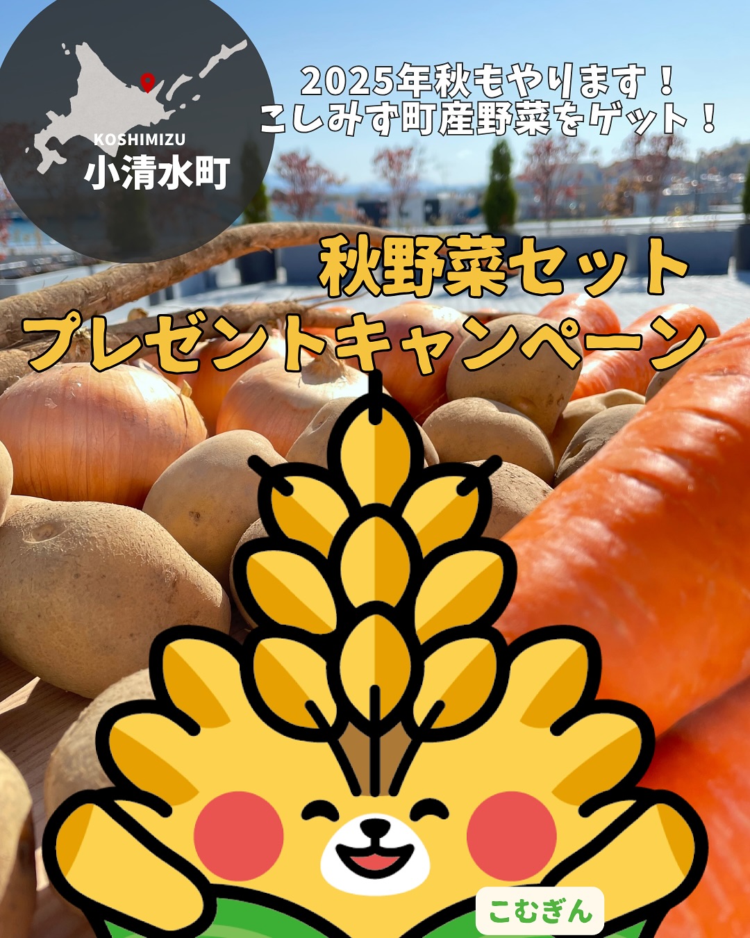 【Instagram懸賞】小清水町産採れたて野菜セットを5名様にプレゼント 2025.11.06JAこしみずプレゼント企画第11弾 賞品:小清水町産採れたて野菜セット(5名様) 締切:2025年11月9日(日)応募方法: 1. 公式Instagramアカウントをフォロー 2. 対象の投稿に「いいね!」※詳細はキャンペーンページにてご確認ください。応募はこちらから