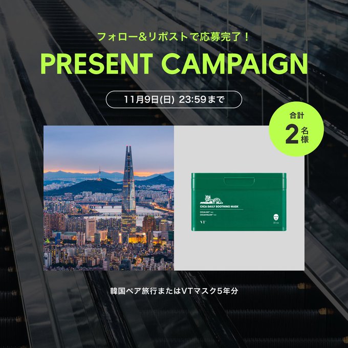 賞品:韓国ペア旅行、VTパック5年分(2名様)